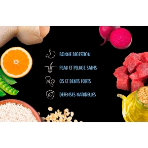 Frisches Fleisch von Hühnern und Truthühnern (15%), entwässertes Huhn, Erbsen (9%), Reis (8.5%), Mais, entwässertes Schweinefleisch, Weizen, Hühnerfett (5%),