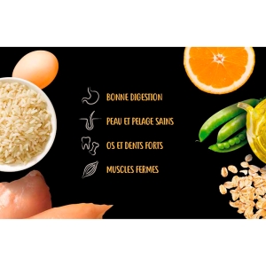 Frisches Fleisch von Hühnern und Truthühnern (21%), entwässertes Huhn, Reis (14%), entwässertes Schweinefleisch, Erbsen (7.5%), Hafer (7%), Mais, Fett