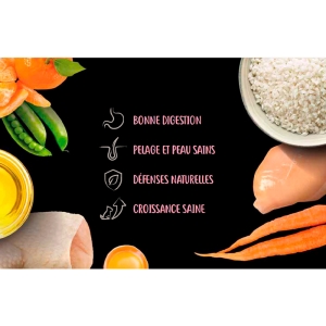 Frisches Fleisch von Hühnern und Truthühnern (21%), entwässertes Huhn, Reis (15%), Erbsen (9%), entwässertes Ei (6%), Proteinhydrolysat,